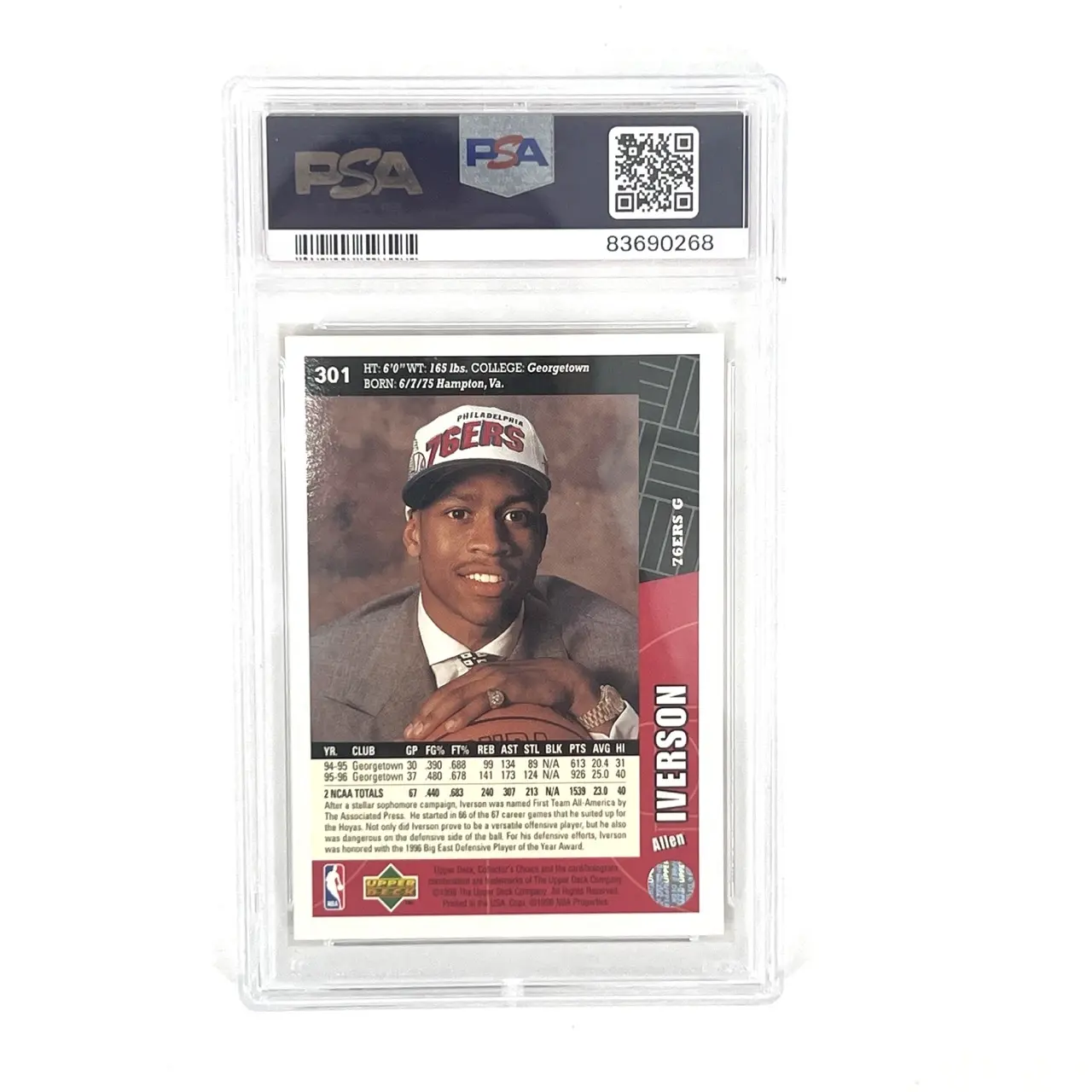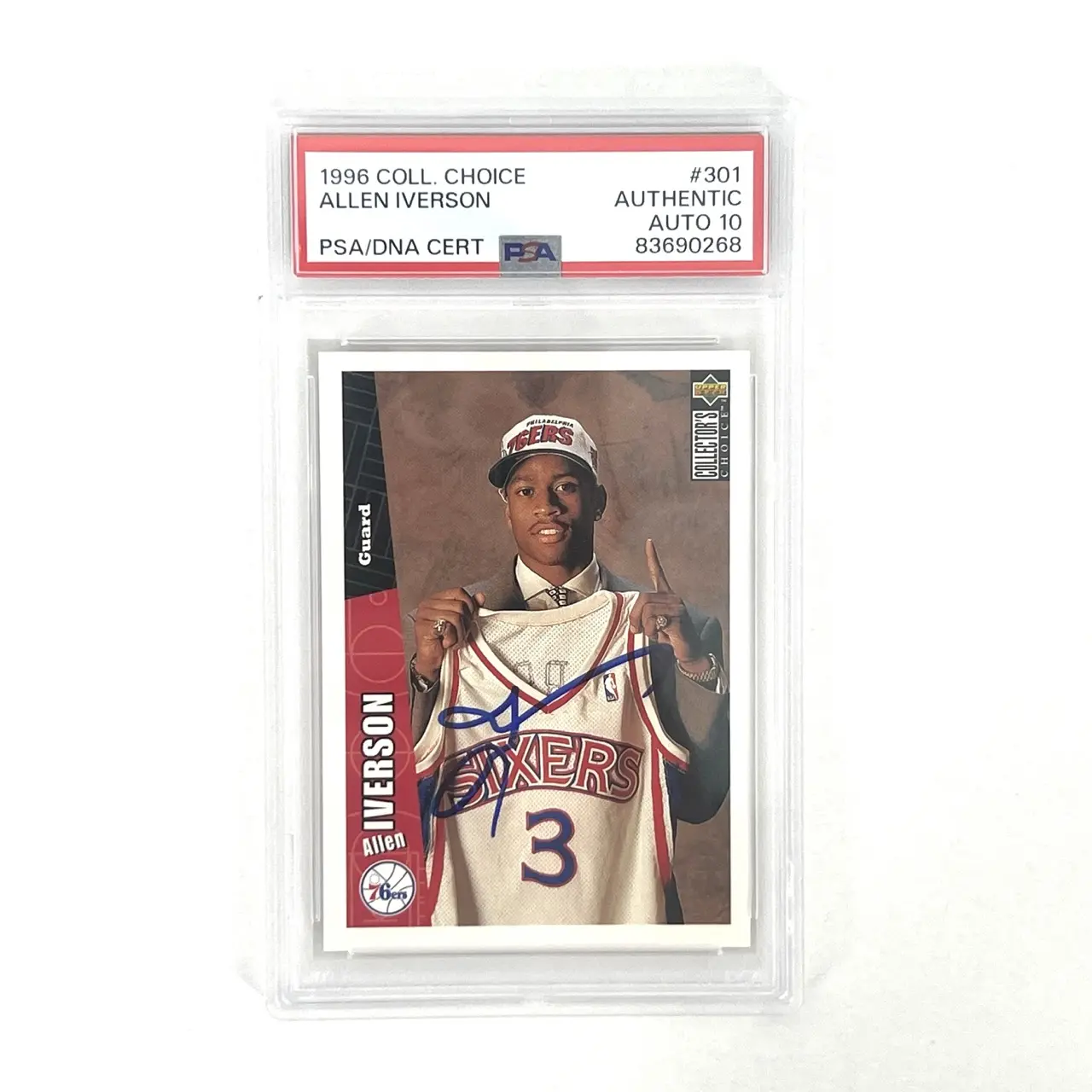 Carte NBA Upper Deck Collectors Choice Rookie 1996 Philadelphie 76ers signée par la légende Allen IVERSON. Encapsulée et autographe PSA 10.