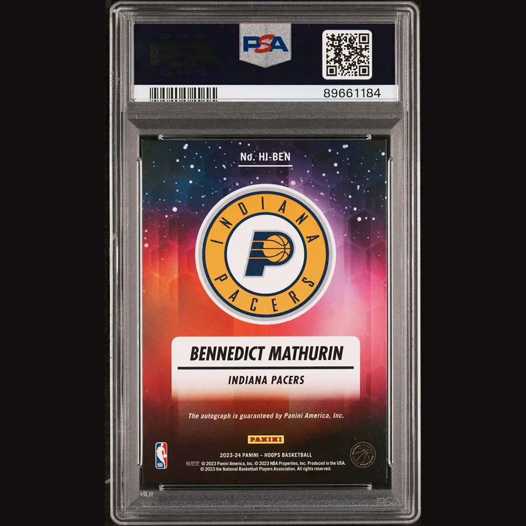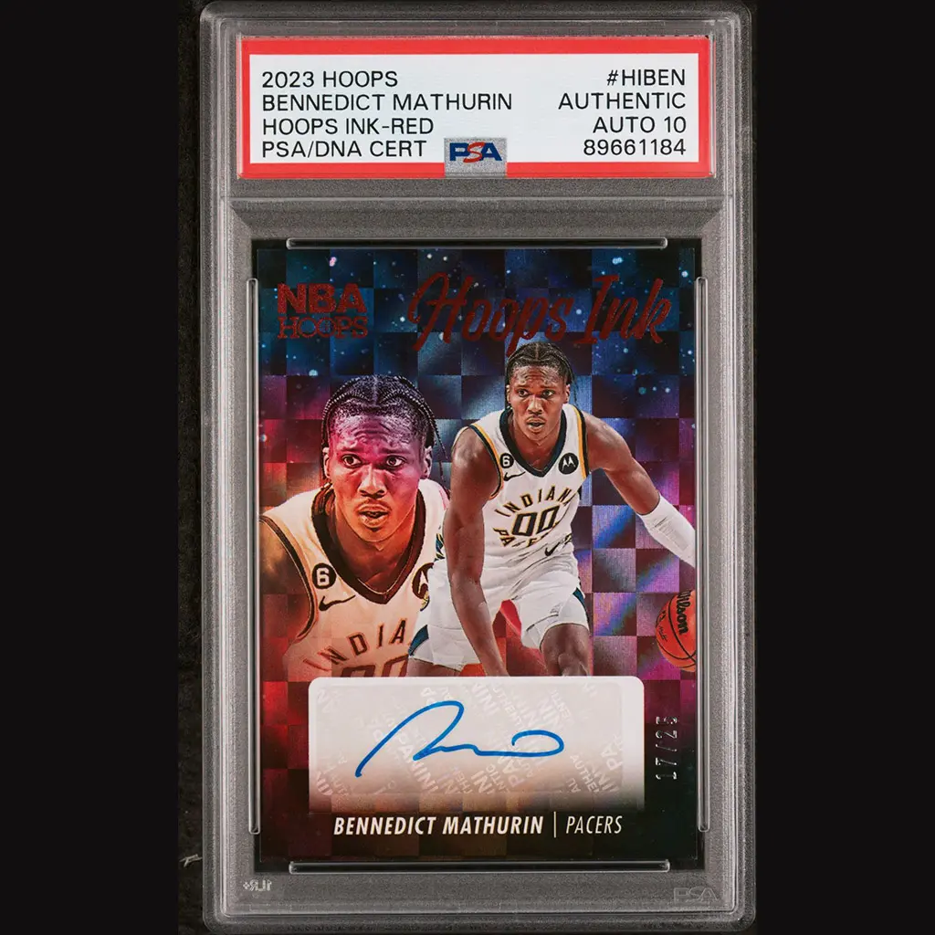 Carte Panini NBA Hoops ink Indiana Pacers, numérotée #17/25 et signée par Bennedict MATHURIN. Encapsulée et gradée PSA 10.