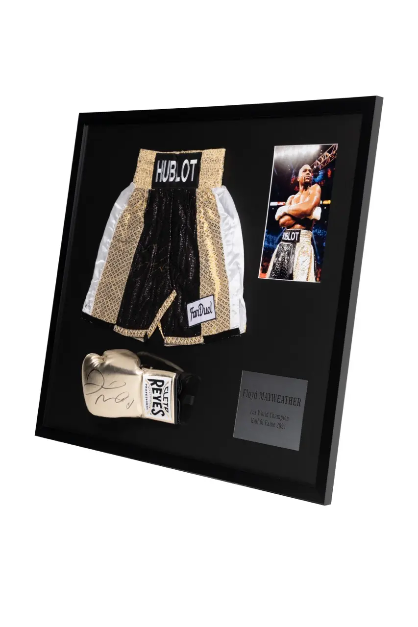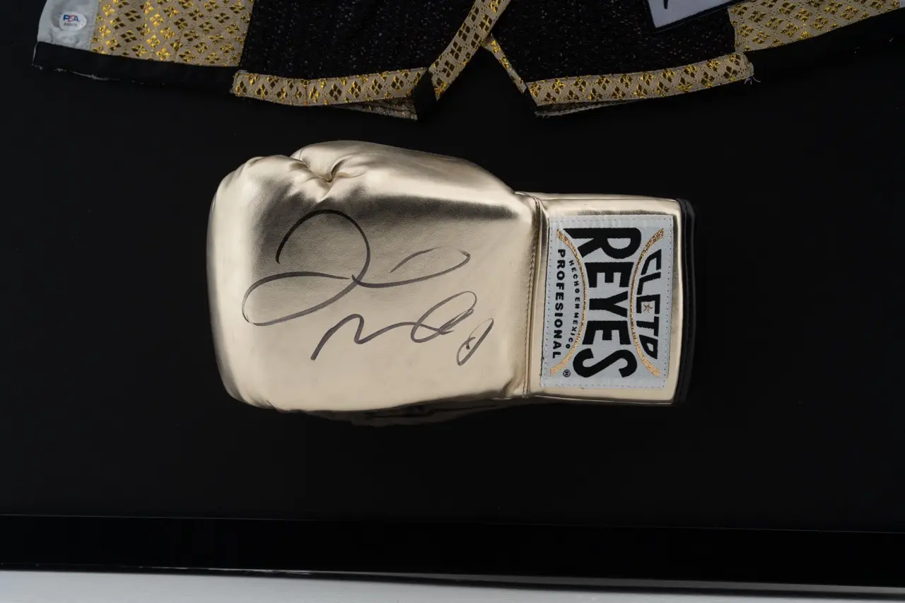Short et gant de boxe Cleto Reyes signés par la légende aux 50 combats et 0 défaites, Floyd MAYWEATHER. Encadrement artisanal en bois et vitre en plexiglas. Dimensions 101 x 84 x 3 cm. Certificat d’authenticité de la signature pour le short délivré par PSA, Beckett pour le gant.