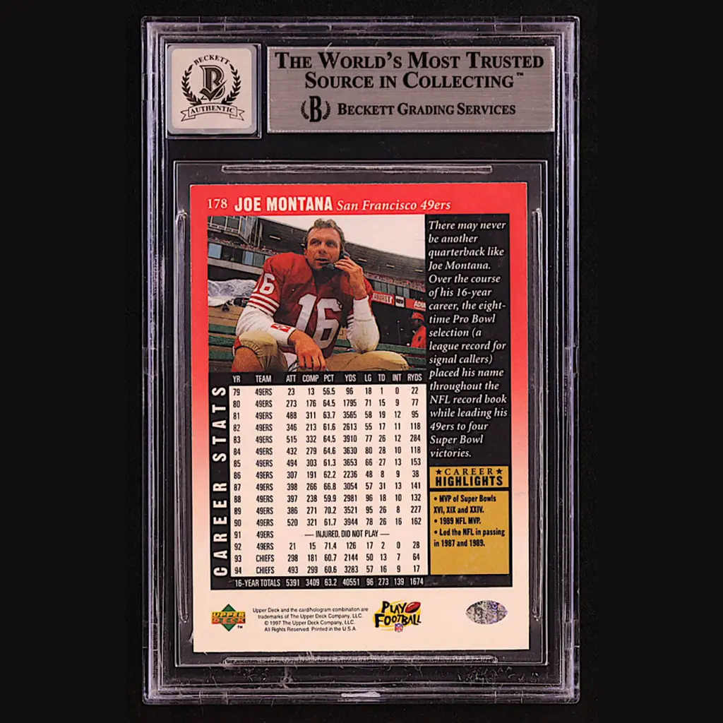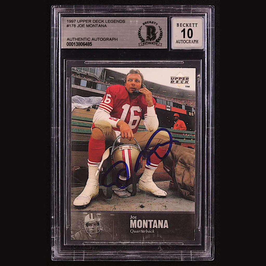 Carte NFL Upper Deck Legends 1997 des San Francisco 49ers, signée par la légende Joe MONTANA. Encapsulée et gradée Beckett 10.