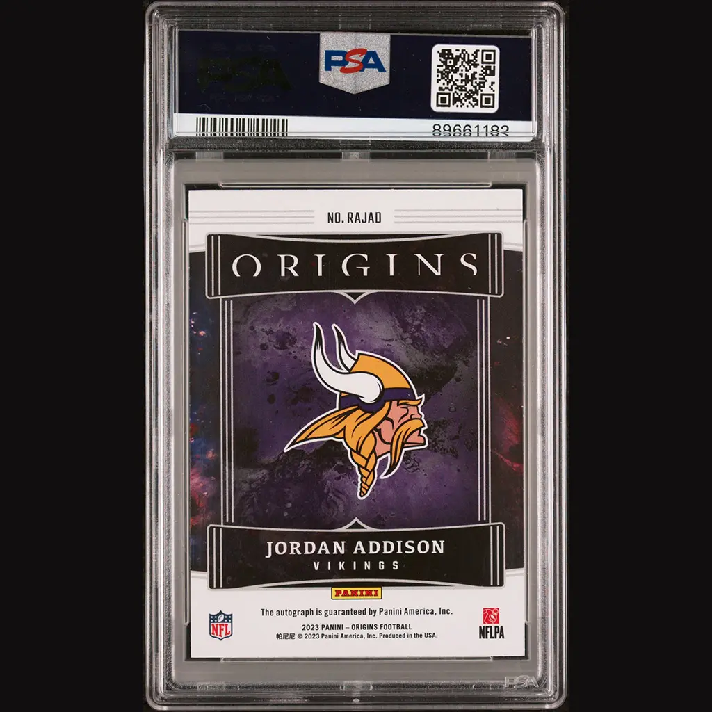 Carte Panini Origins 2023 Vikings Rookie, numérotée #7/49 et signée par Jordan ADDISON. Encapsulée et gradée PSA 9.