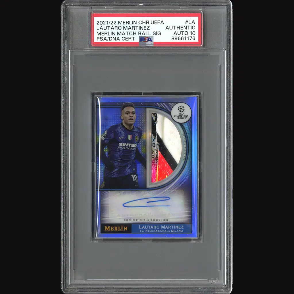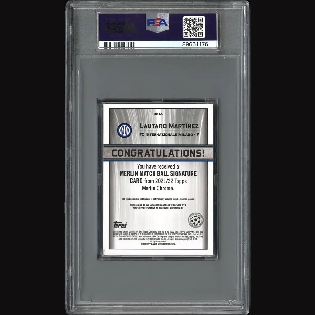 Carte Topps Merlin 21/22 Inter Milan Match Ball officiel et signée par Lautaro MARTINEZ. Encapsulée et gradée PSA 10.