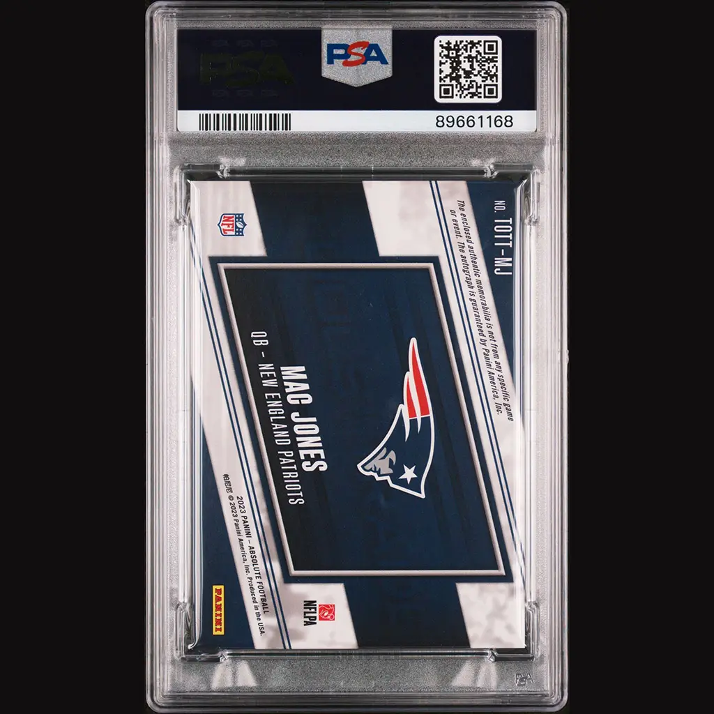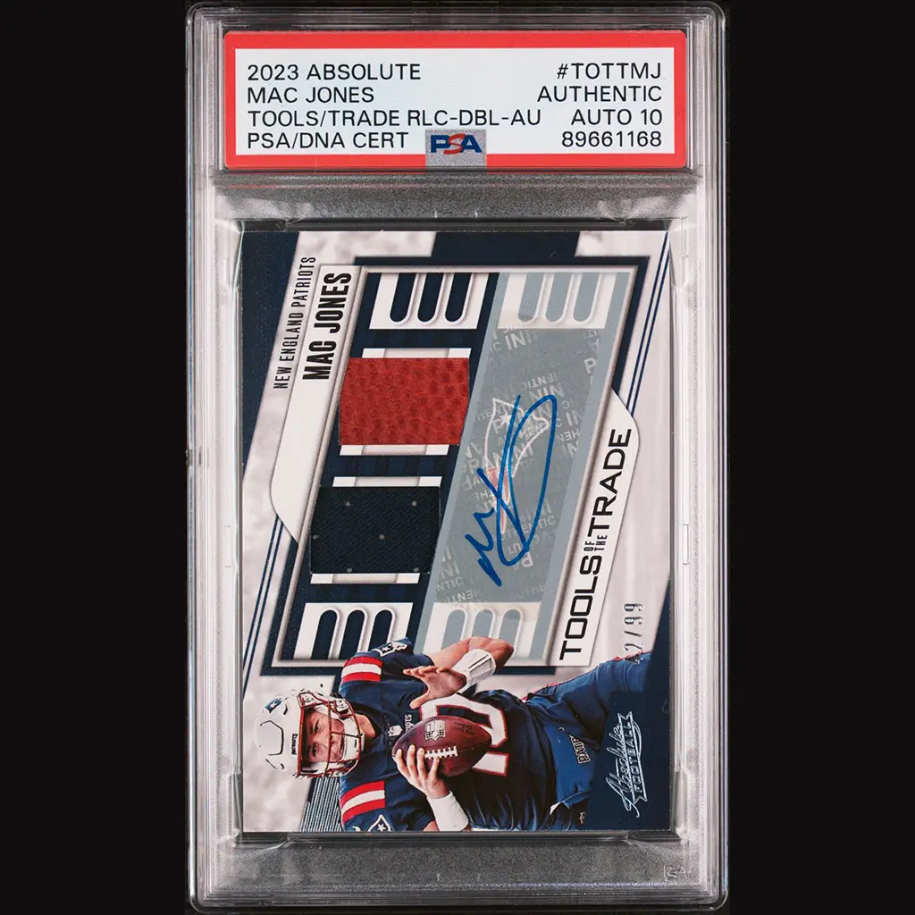 Carte Panini Absolute numérotée #42/99, double patch Auto signée par Mac JONES. Encapsulée et gradée PSA 10.