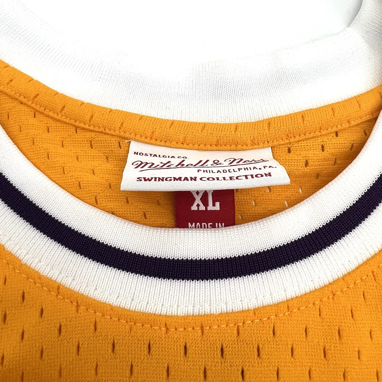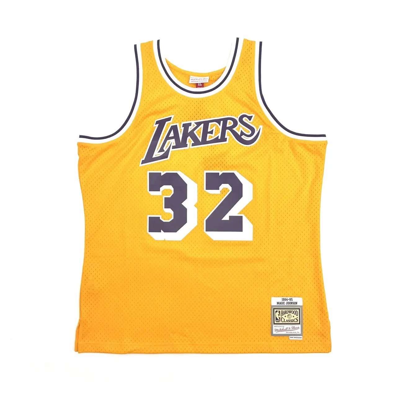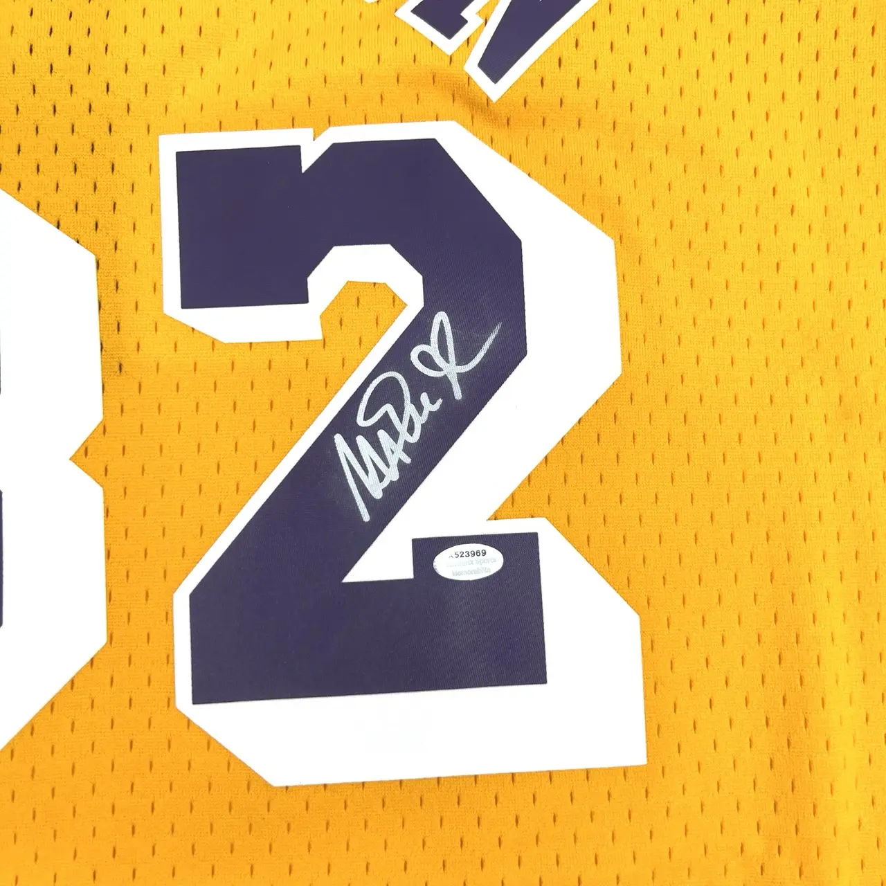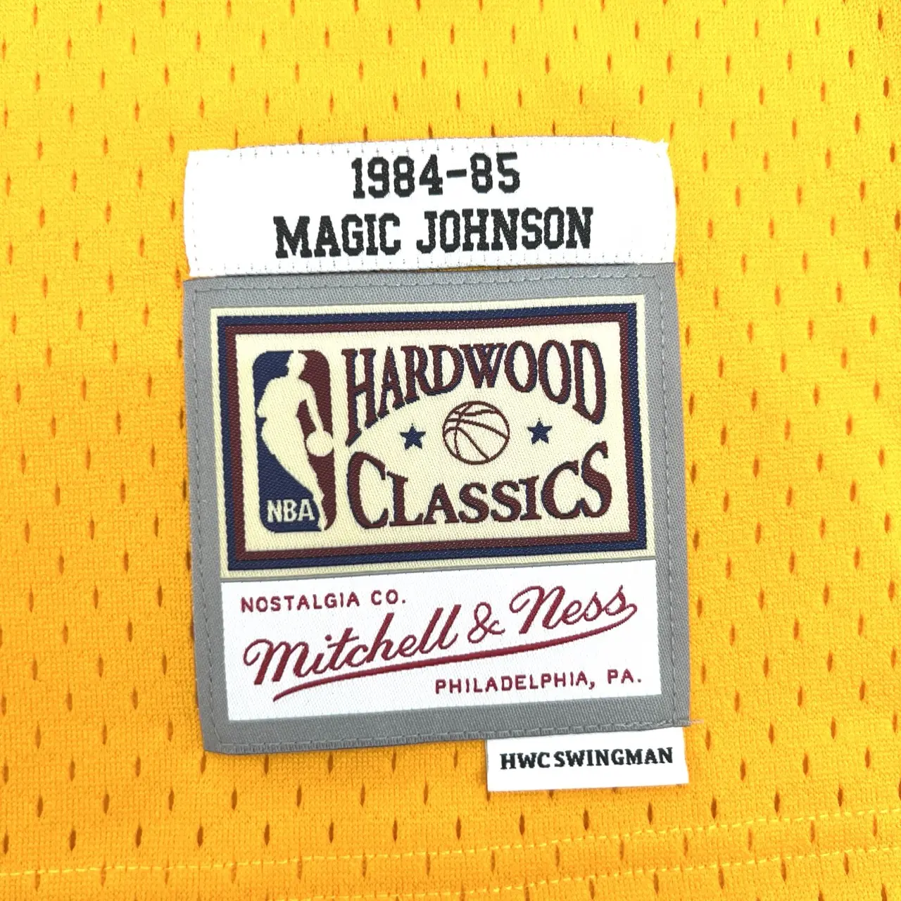Maillot NBA Mitchell&Ness Swingman jaune signé par la légende des Los Angeles Lakers, Magic JOHNSON. Certificat d’authenticité de la signature délivré par Schwartz.