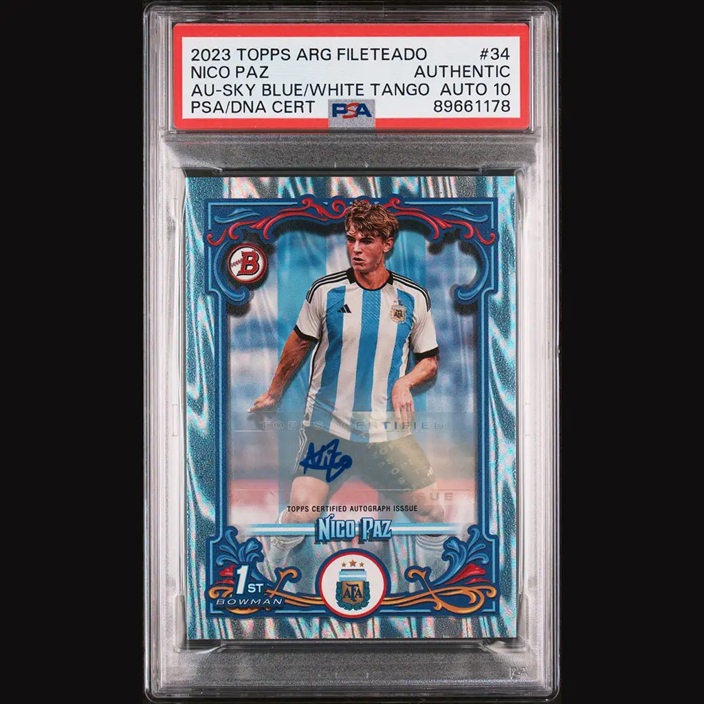 Carte Topps Argentine Fileteado 2023 Sky blue/white Tango numérotée #56/99 et signée par Nico PAZ. Encapsulée et gradée PSA 10.