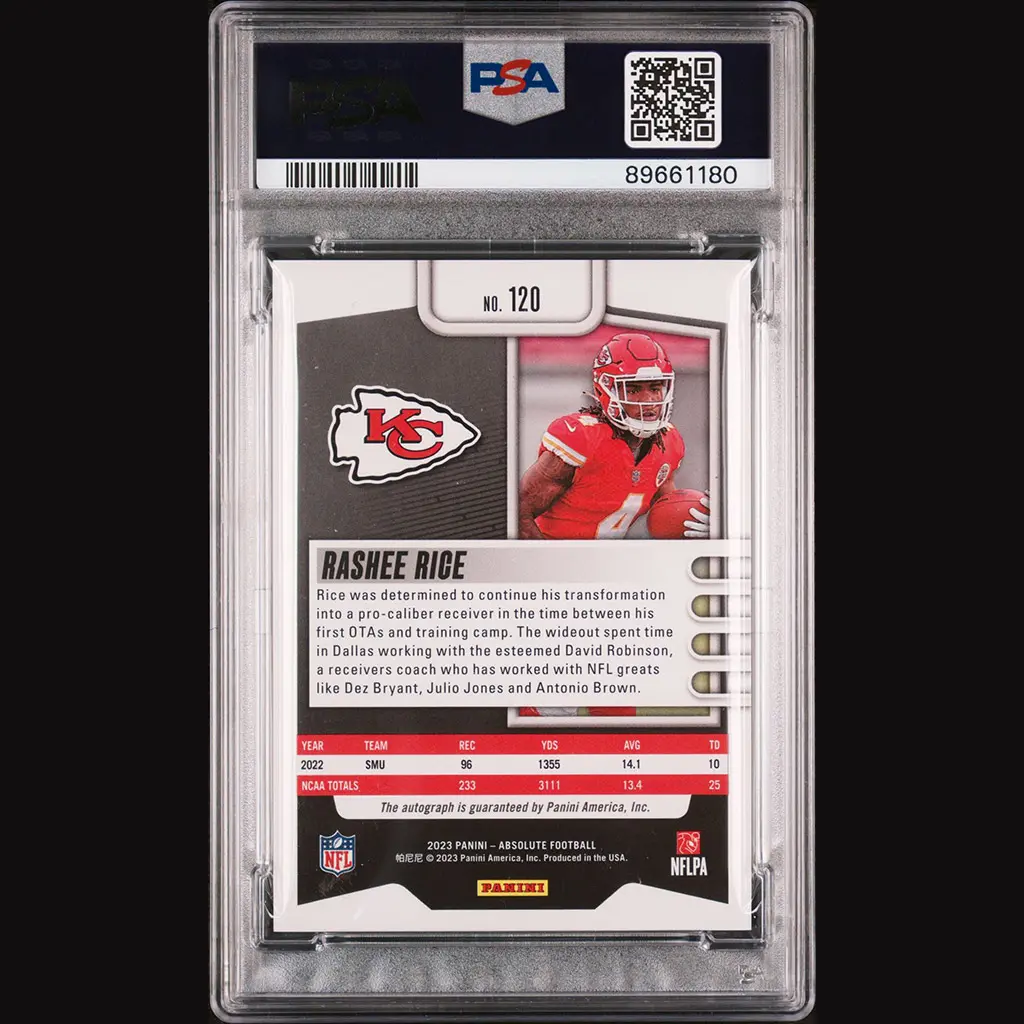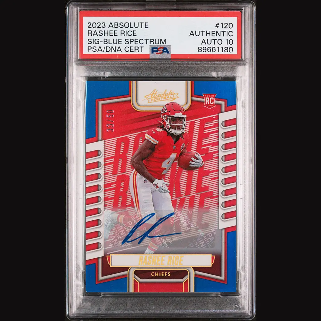 Rashee RICE – Carte Panini Absolute RC Spectrum blue Chiefs Auto #33/50. PSA 10.