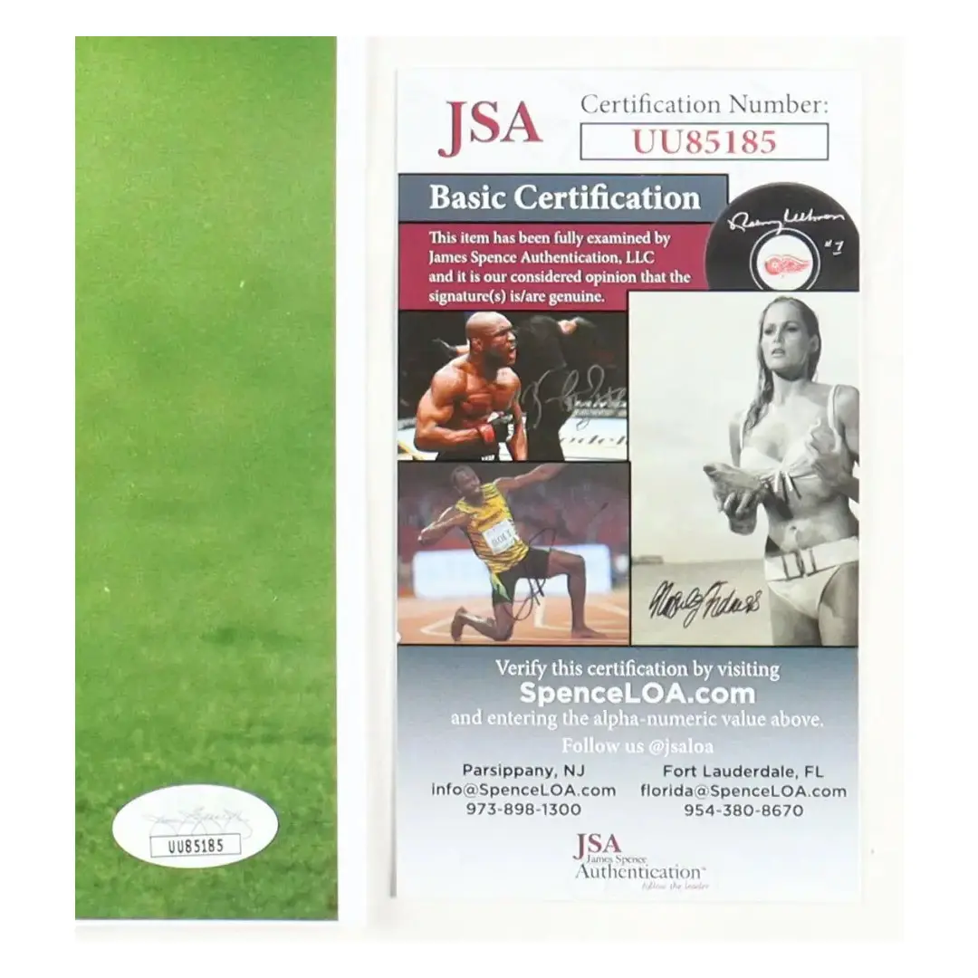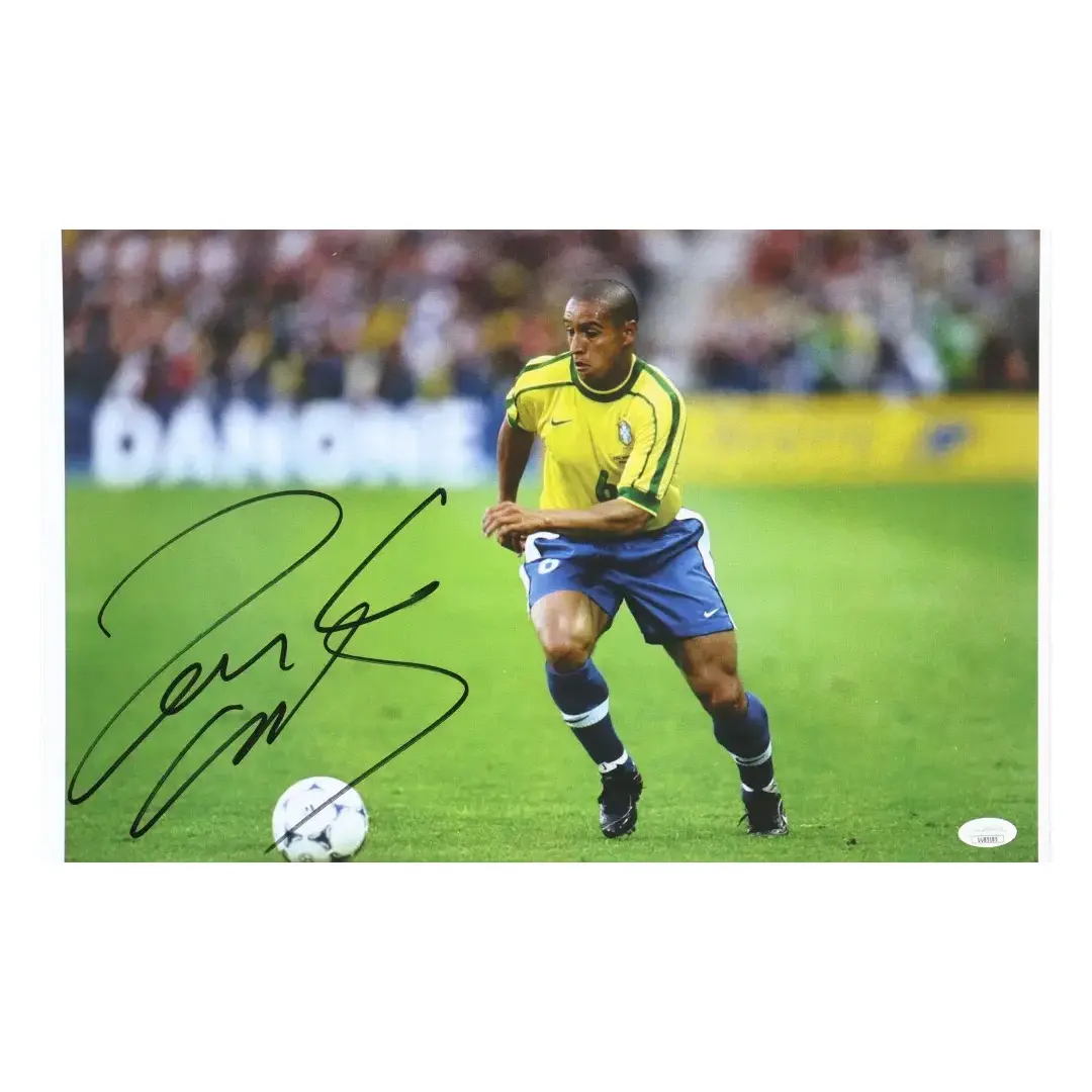 Photo signée par la légende du Brésil et du Real Madrid, Roberto CARLOS.Certificat d’authenticité de la signature délivré par JSA. Dimensions 43 x 28 cm.